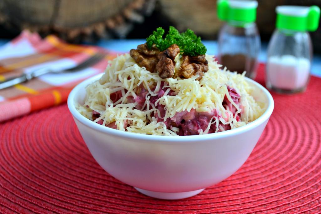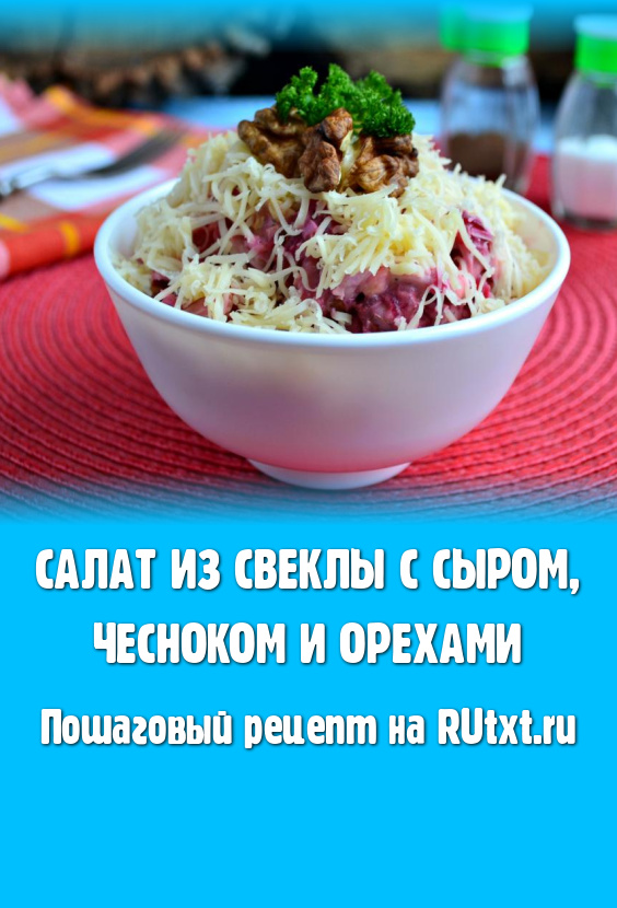 Предлагаю вам попробовать салат из свеклы с сыром, чесноком и орехами. Салатик готовится из простых продуктов и получается очень вкусным. Его можно подать на обед или ужин, можно предложить и гостям. Майонез можно заменить сметаной, добавив к ней немного готовой горчицы.