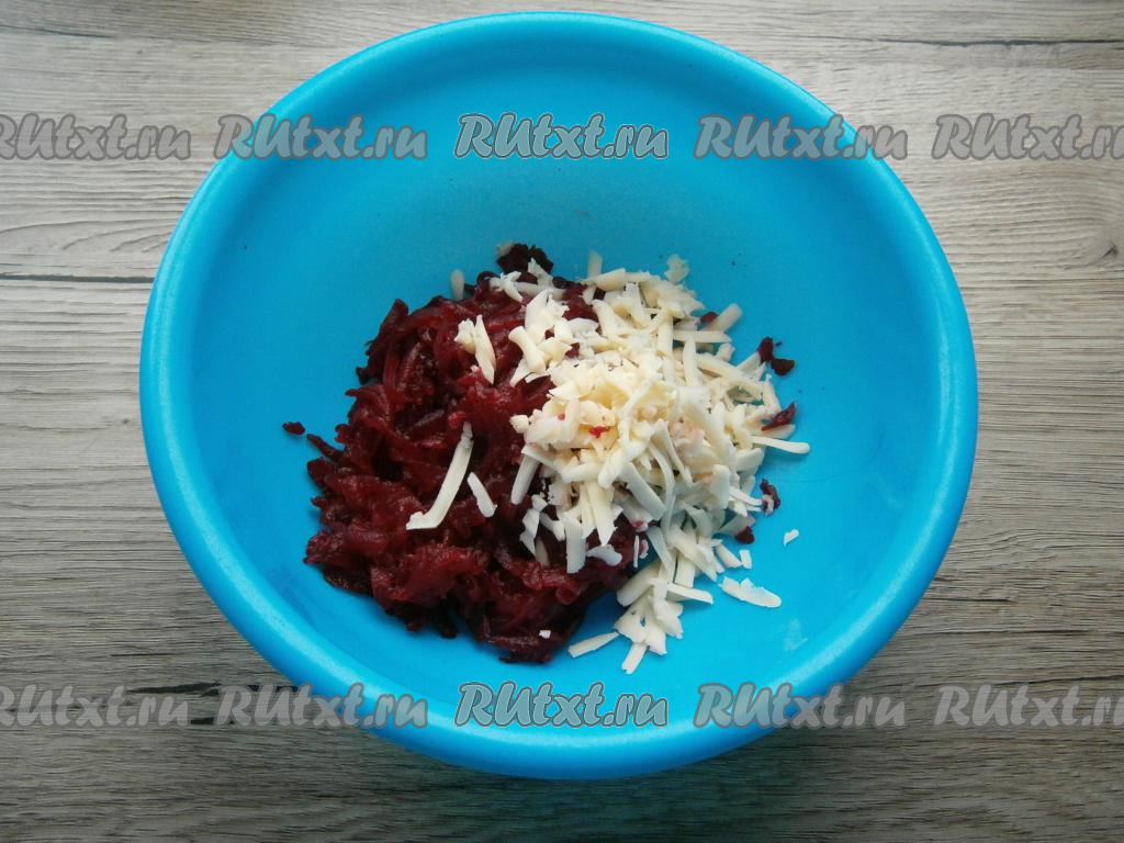 Твёрдый сыр и очищенную вареную свеклу натереть на крупной терке (немного сыра оставить для подачи).