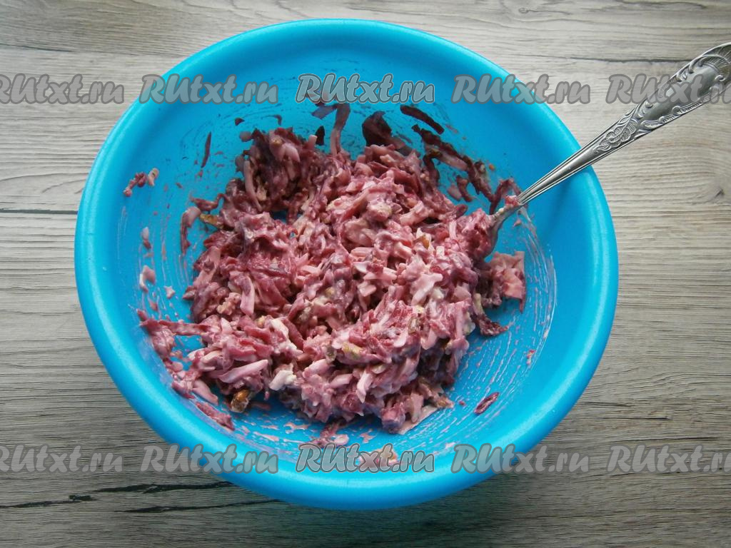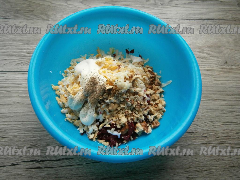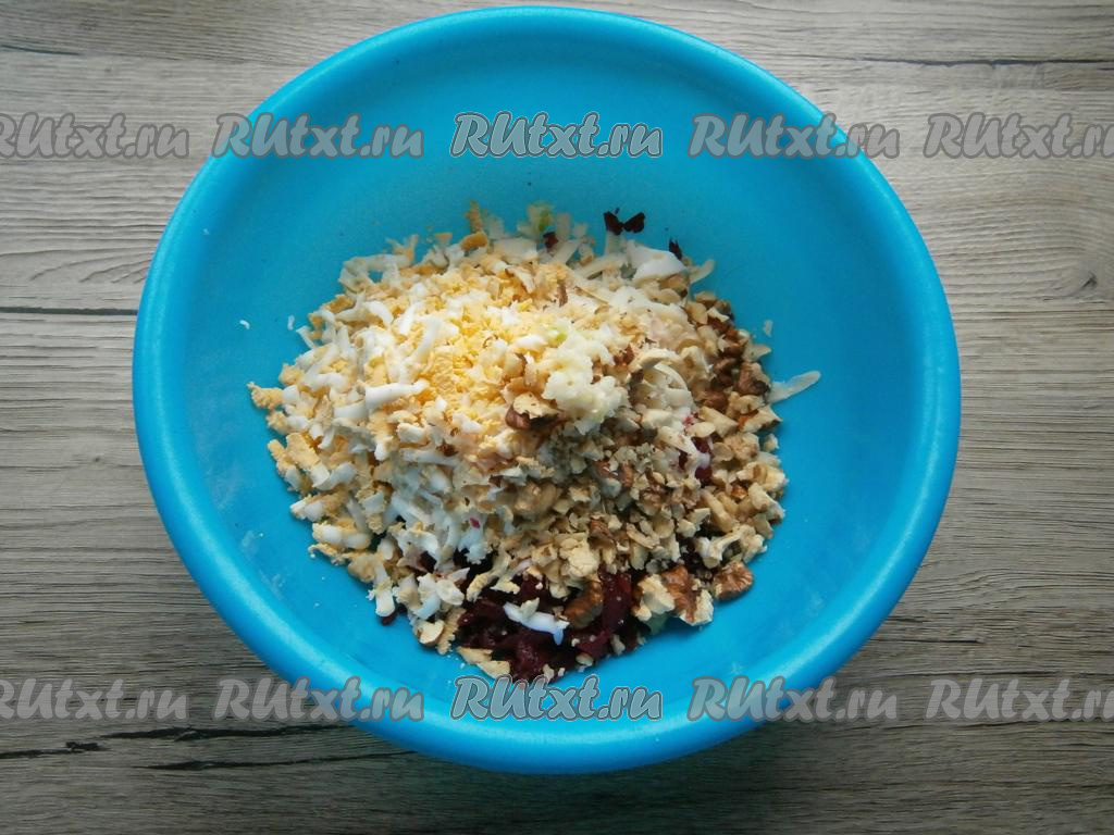 Орехи грецкие очистить от скорлупы, ядра порубить. Ядра грецких орехов вместе с пропущенным через пресс чесноком и с натертыми на крупной терке вареными яйцами добавить в салат из свеклы и сыра.