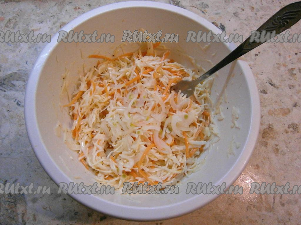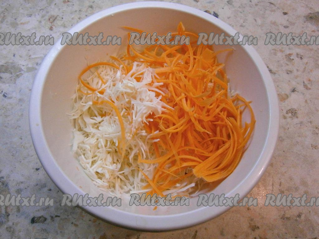 Морковку и лук очистить. Капусту тонко нашинковать, добавить к ней натертую на крупной терке или корейской терке морковь.