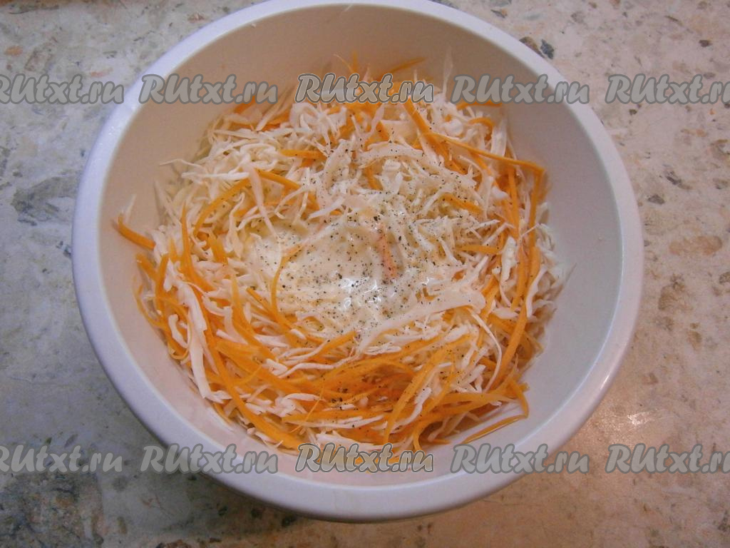 Вылить заправку в салат из капусты и моркови, поперчить хорошенько черным и белым перцами.