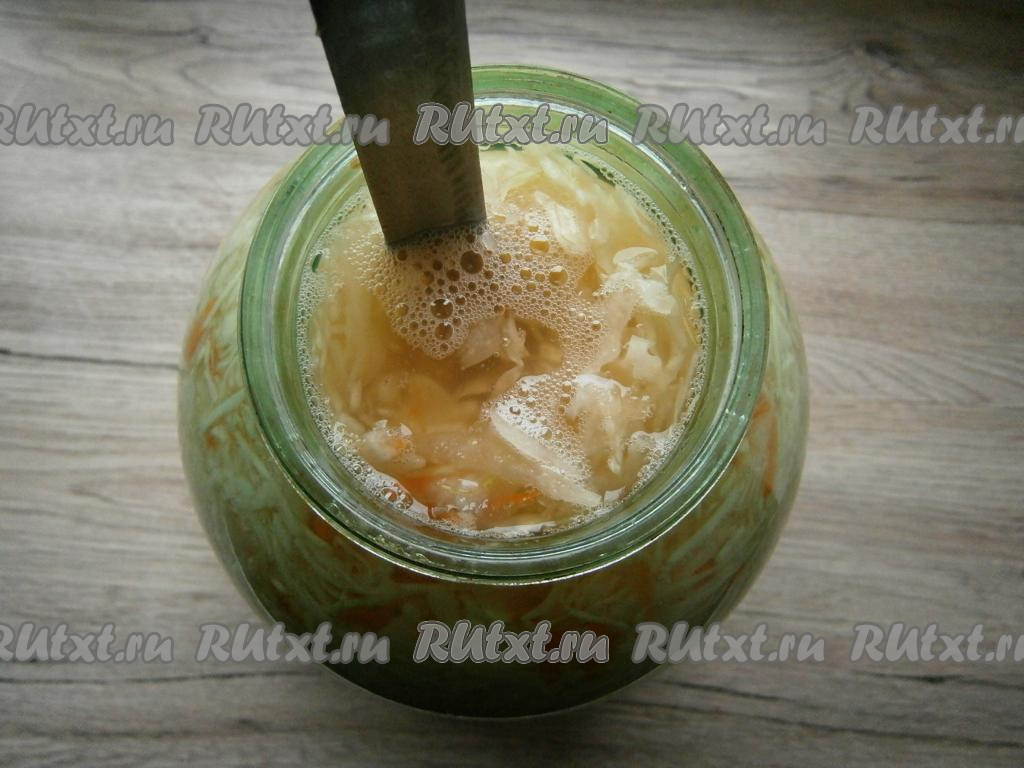 В это же время (через сутки) капусту нужно проткнуть длинным ножом посередине до самого дна банки, чтобы пузырьки газа выходили наружу.