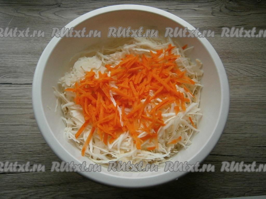 Для приготовления этой капусты выбирайте вилок с белыми листьями, тугой и не порченый. Капусту тонко нашинковать. Добавить натертую на крупной терке очищенную морковь.