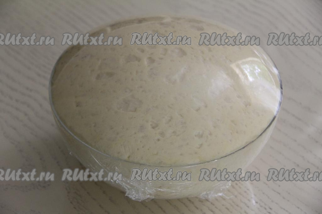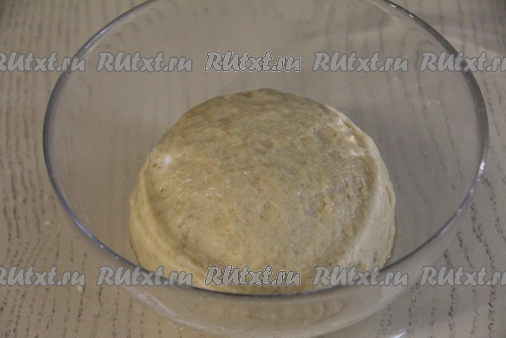 Миску с замешанным сдобным дрожжевым тестом накрыть плёнкой (или полотенцем) и убрать в тёплое место на 1,5-2 часа. Тесто хорошо поднимется, увеличившись в объёме почти в 3 раза.