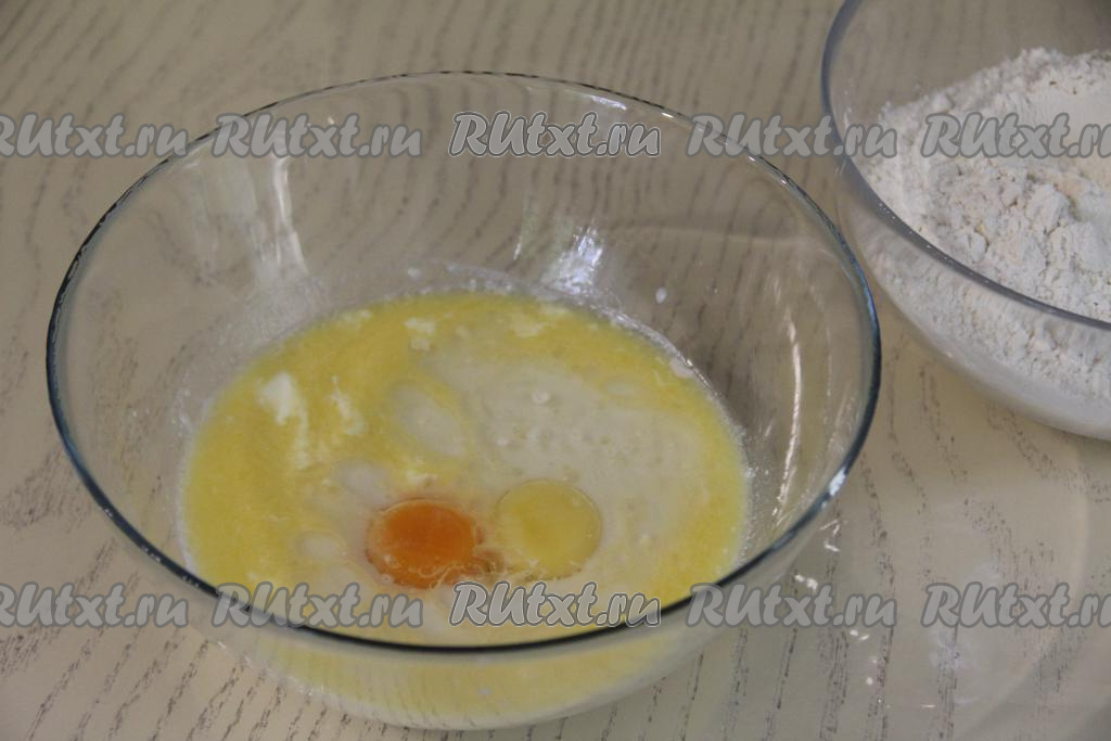Тёплое молоко влить в миску, всыпать 1 столовую ложку сахара и все дрожжи, перемешать и оставить на 15 минут в тёплом месте (за это время на поверхности опары появится пышная шапка). Молоко не должно быть горячим, его температура не должна превышать 40 градусов, потому что в горячем молоке дрожжи могут погибнуть, а значит тесто не поднимется. Сливочное масло растопить и слегка остудить. Не горячее сливочное масло влить в миску с запенившейся молочно-дрожжевой смесью, вбить сюда же сырые яйца, всыпать соль и оставшийся сахар.