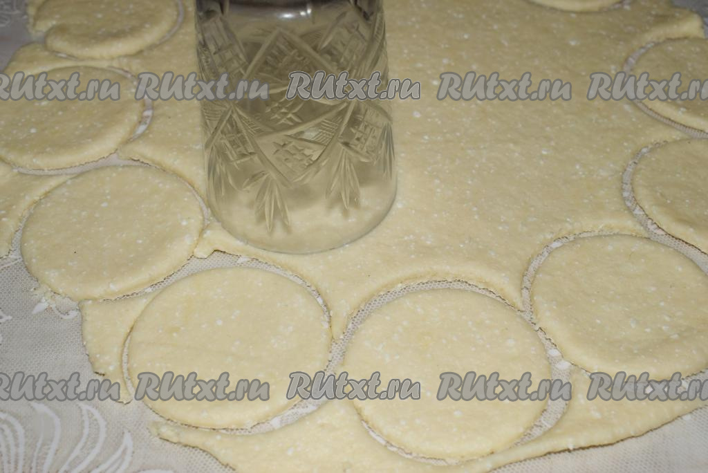 Охлажденное тесто раскатываем на столе, присыпанном мукой. Толщина пласта около 0,5 см. Из раскатанного теста вырезаем при помощи стакана кружочки.