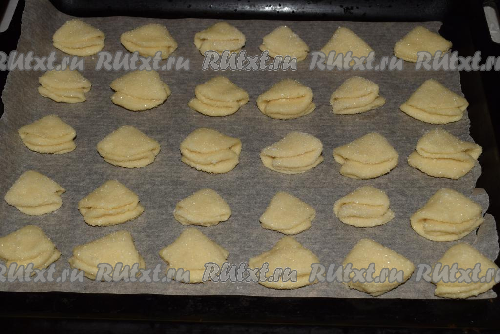 На противень, застеленный пергаментом, выкладываем подготовленные заготовки печенья "Ушки" так, чтобы сторона печенья без сахара оказалась на пергаменте.