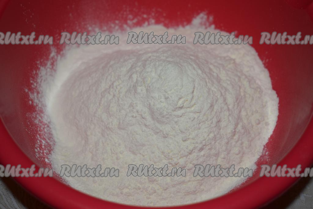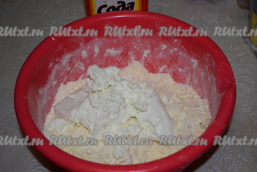 К смеси масла и муки добавляем творог и соду, погашенную уксусом.