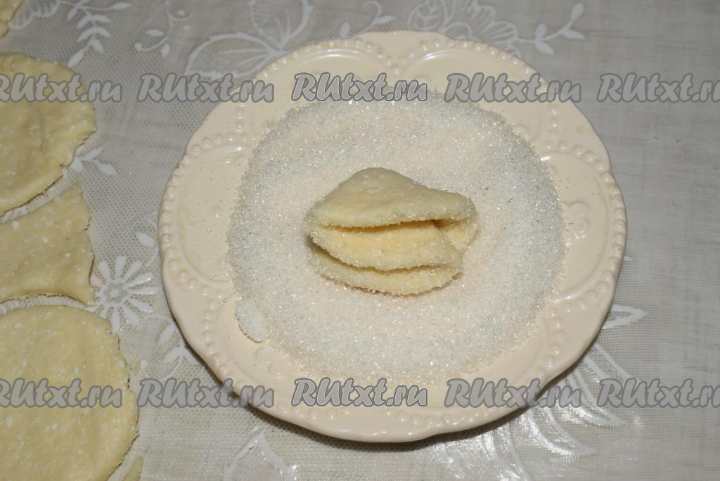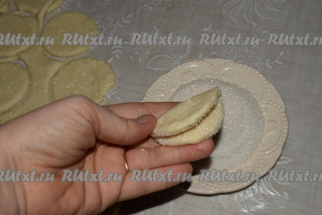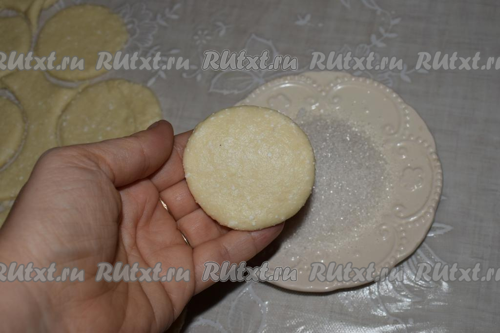 Сахар насыпаем в плоское блюдце. Берем в руку кружочек теста и одной стороной опускаем в сахар.