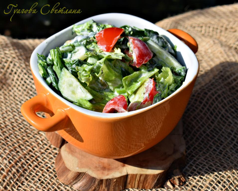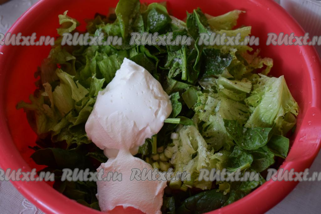Солим и перчим по вкусу. Заправляем овощной салат с зеленью сметаной и аккуратно перемешиваем, чтобы не помять листы салата.