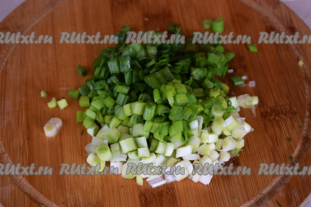 Зеленый лук нарезаем на тоненькие колечки.