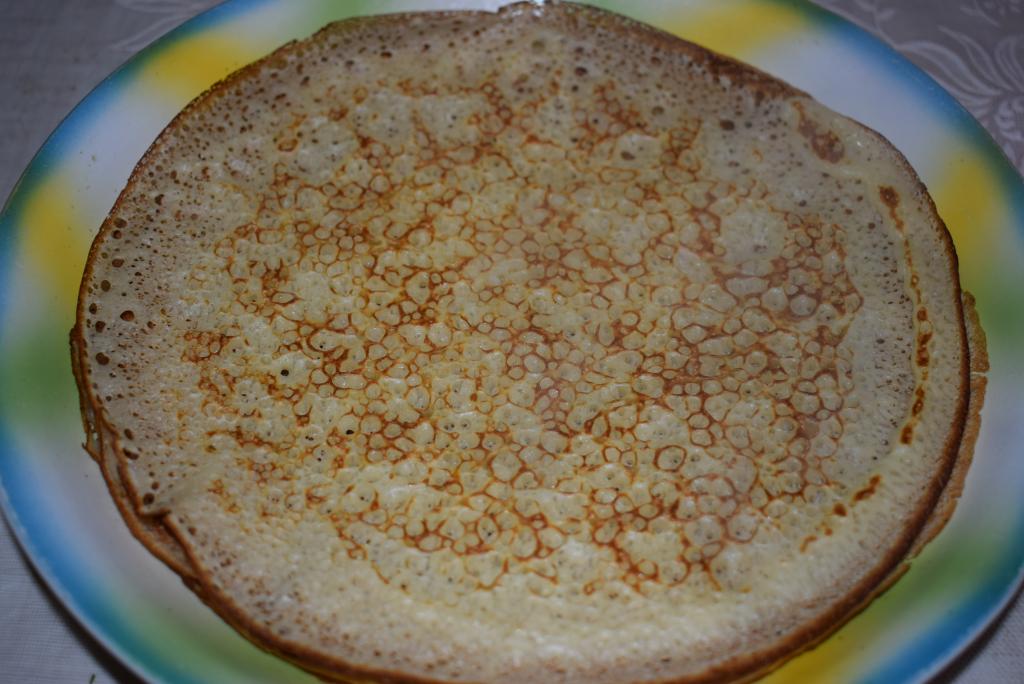 Перед жаркой первого блина сковороду нужно смазать растительным маслом, хорошо разогреть на достаточно сильном огне. На хорошо разогретую сковороду налить небольшой половник теста, равномерно распределяя его по поверхности сковородки.