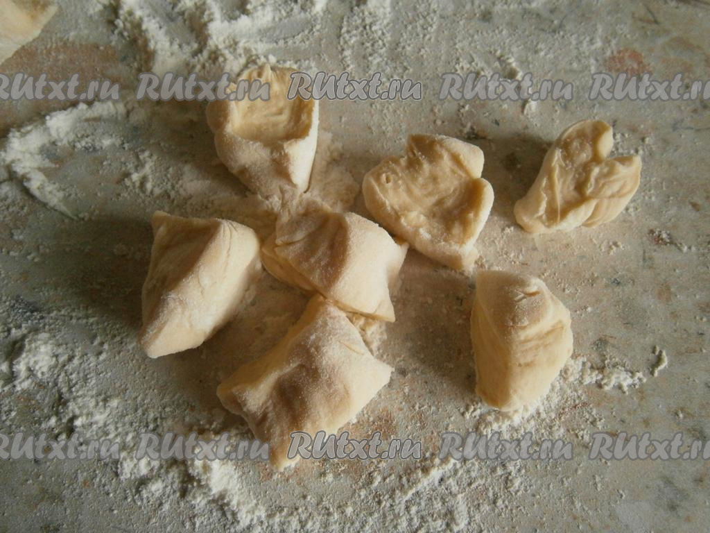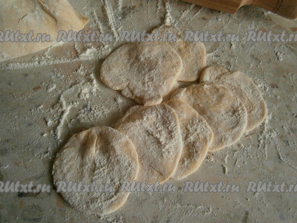 На столе, присыпанном мукой, раскатать каждый кусочек теста в небольшую лепешку.