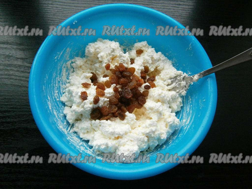 Хорошенько растереть творог с сахаром, по желанию, добавить горсть изюма, перемешать и творожная начинка для вареников готова.