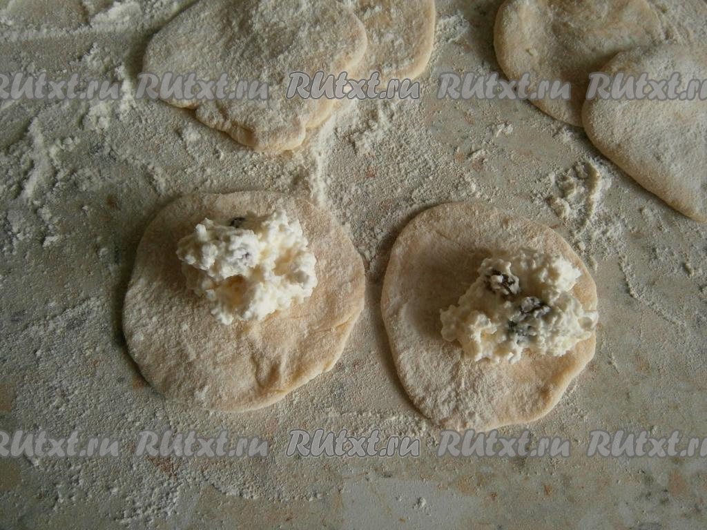 В середину лепешек поместить по чайной ложке творожной начинки.