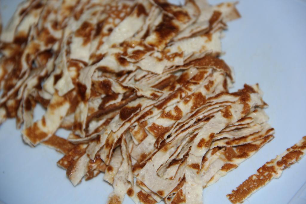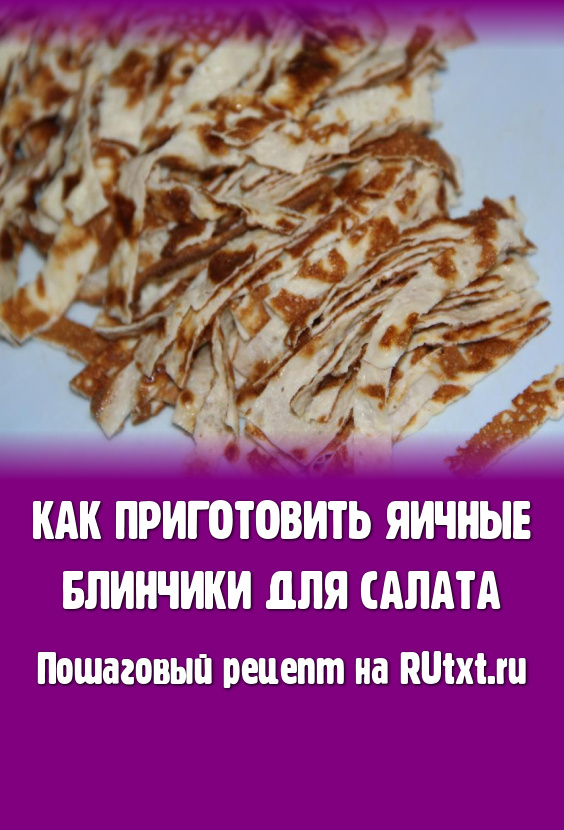 Остывшие яичные блинчики нарезать на тонкие полоски. Эти тонкие, нежные блины станут отличным дополнением к различным салатам.