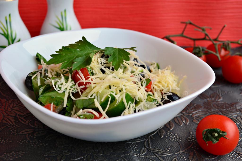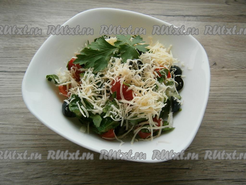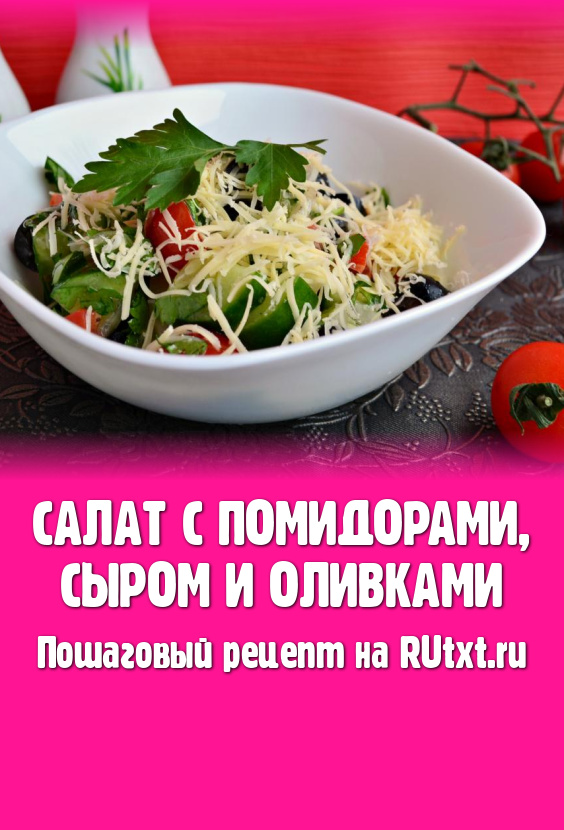 Подать легкий, вкусный витаминный салат, приготовленный с помидорами, сыром и оливками, сразу же к столу.