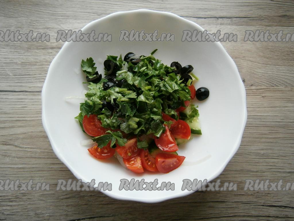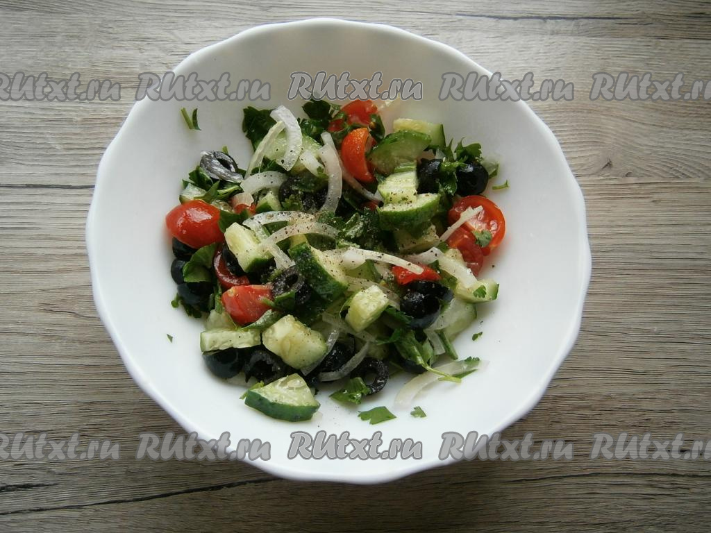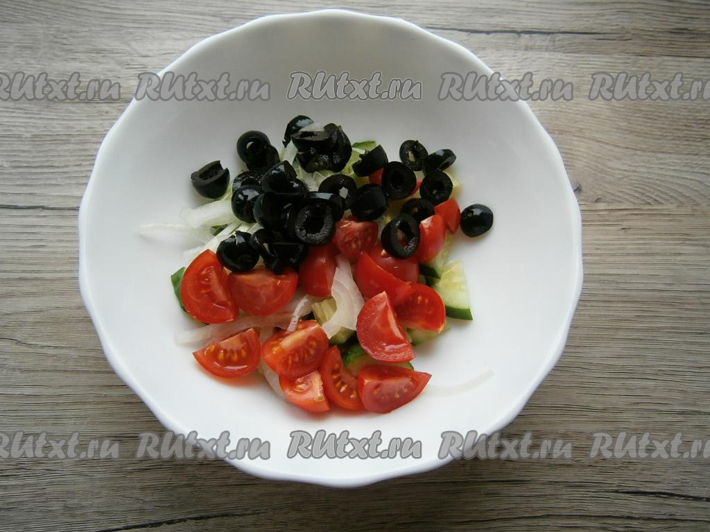 Оливки нарезать на кружочки. В салат из огурцов и лука выложить нарезанные на 2-4 части помидоры черри и кружочки черных оливок.