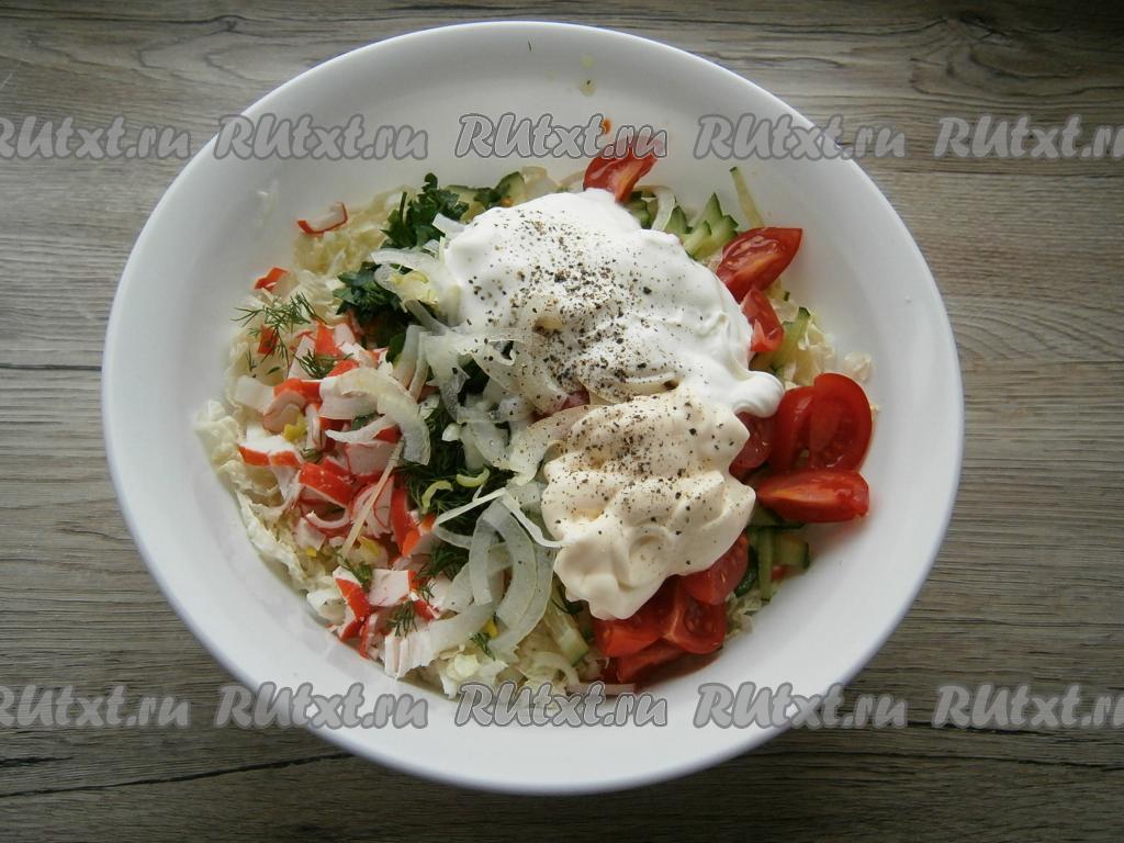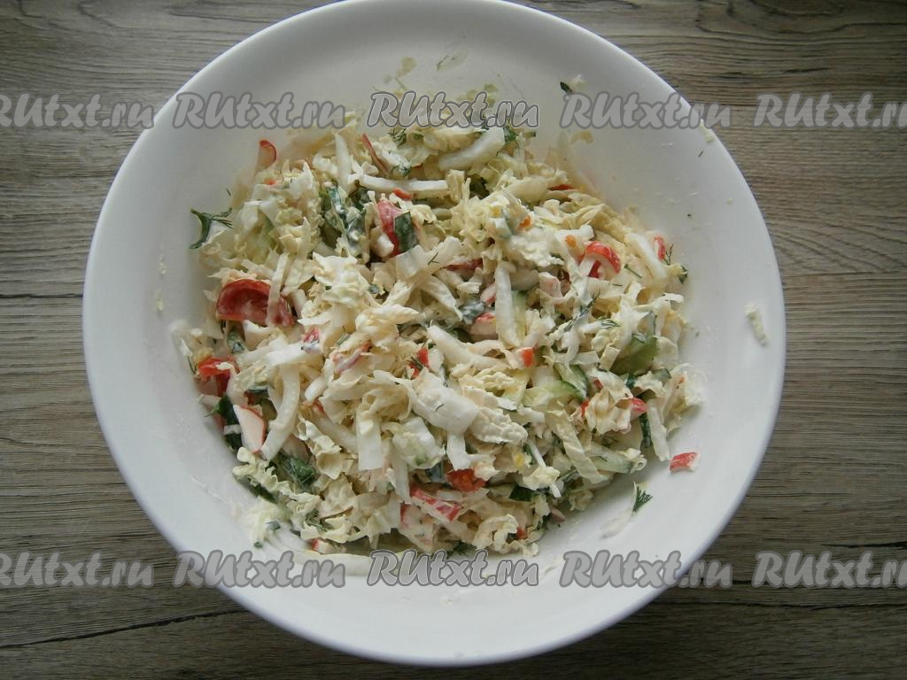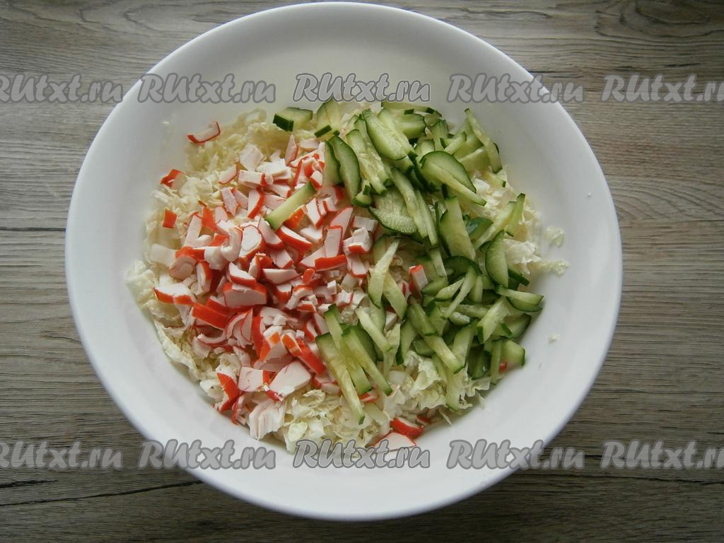 Добавить к пекинской капусте нарезанный брусочками свежий огурец и нарезанные крабовые палочки.