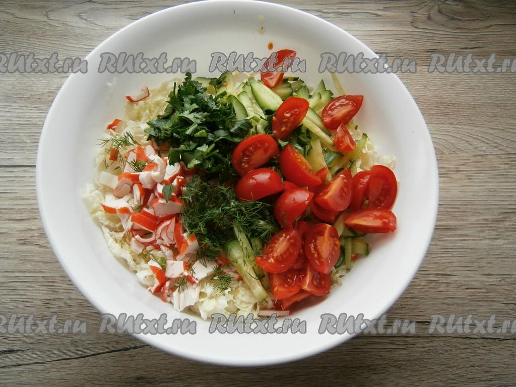 Помидоры нарезать (я готовила с помидорами черри и каждый помидорчик разрезала на 2-4 части). Мелко нарезанную зелень петрушки и укропа, дольки помидоров выложить в салат из огурцов, крабовых палочек и капусты.