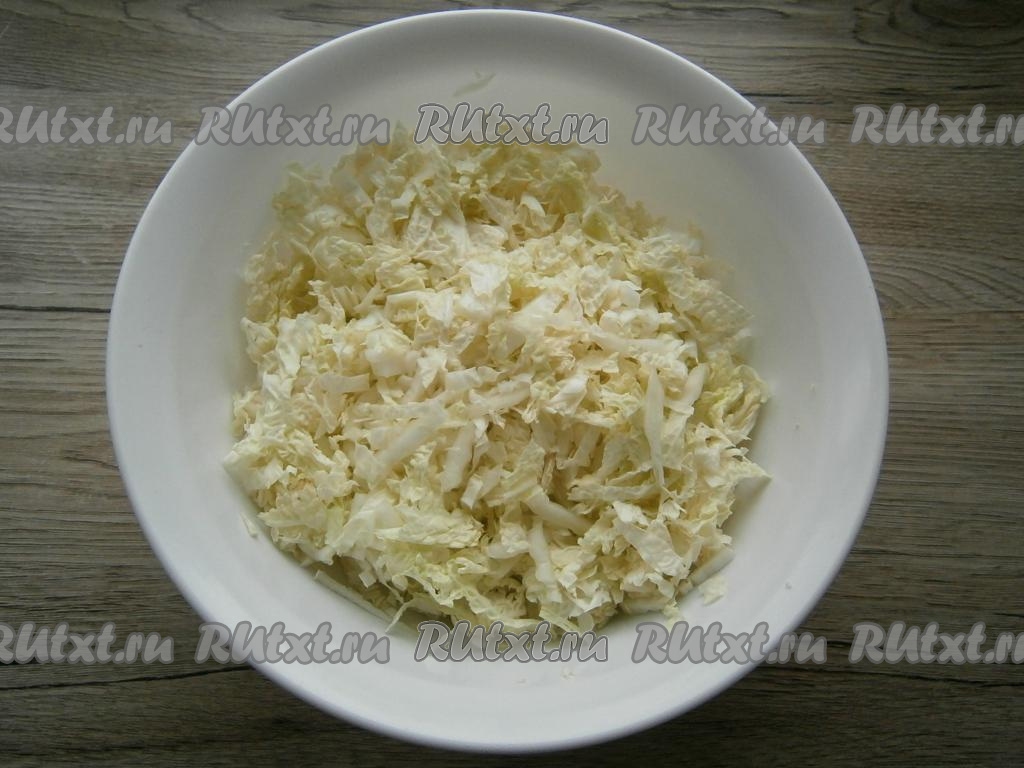 Пекинскую капусту нашинковать, немного посолить и чуть помять руками.