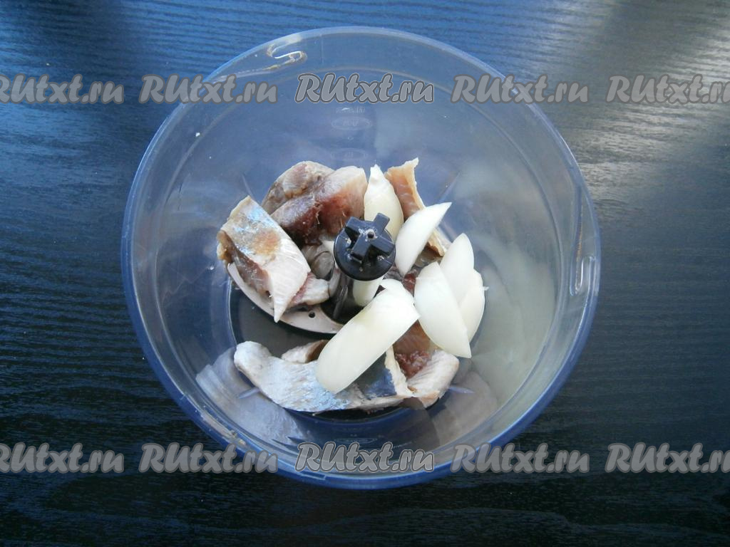 Из филе сельди тщательно удалить косточки, если они есть. В чашу блендера поместить кусочки филе сельди, добавить нарезанный очищенный репчатый лук.