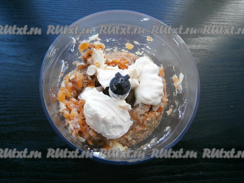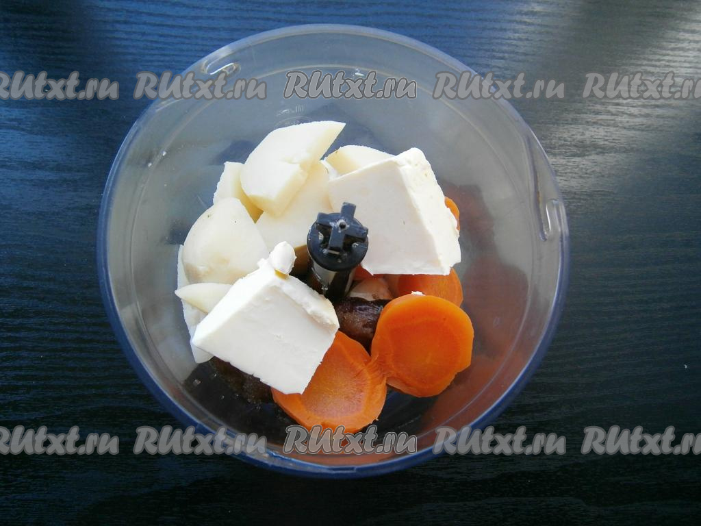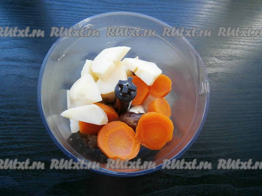 Сюда же добавить кусочки отварной моркови и очищенного отварного картофеля.
