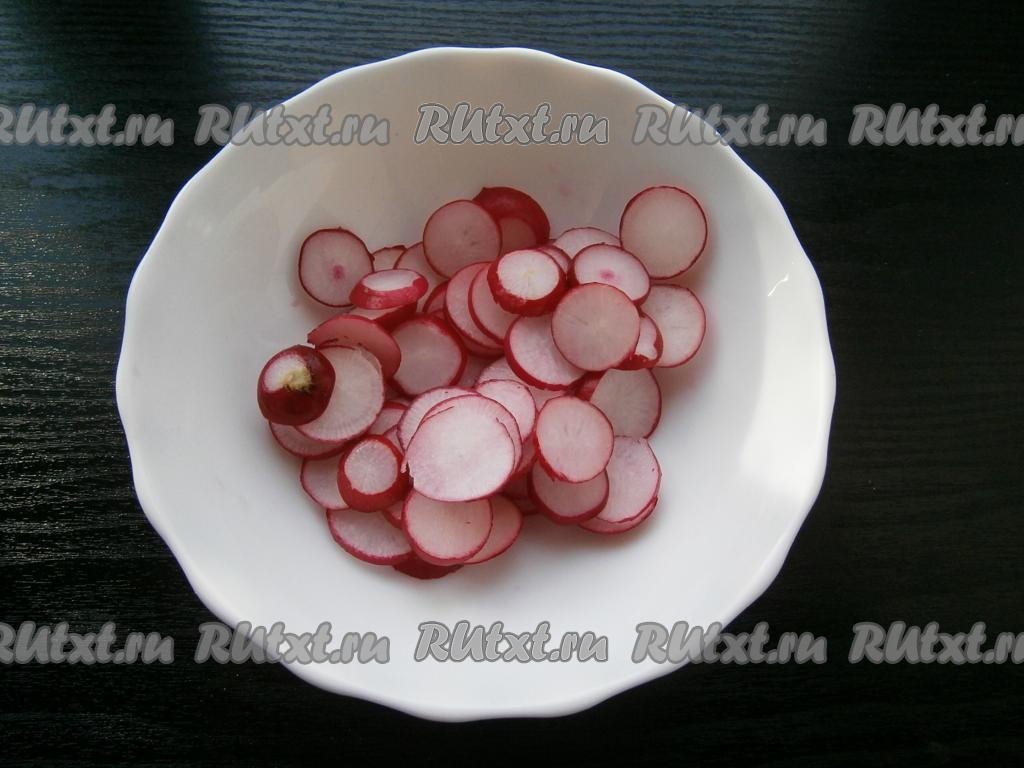 Вымыть редис и, обрезав хвостики, нарезать его тонкими кружочками.