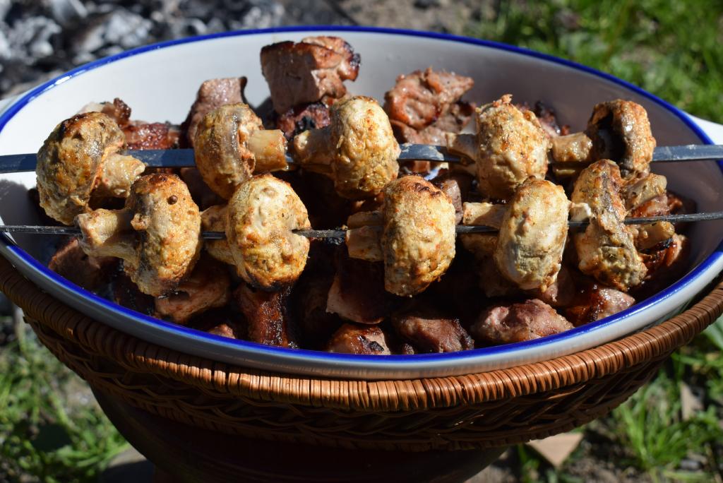 Оставляем шампиньоны для маринования на 2 часа. Разводим костер и ждем, когда он полностью прогорит, чтобы не оставалось открытого огня, а угли хорошо излучали жар. Нанизываем шампиньоны на шампуры и выкладываем на мангал.
