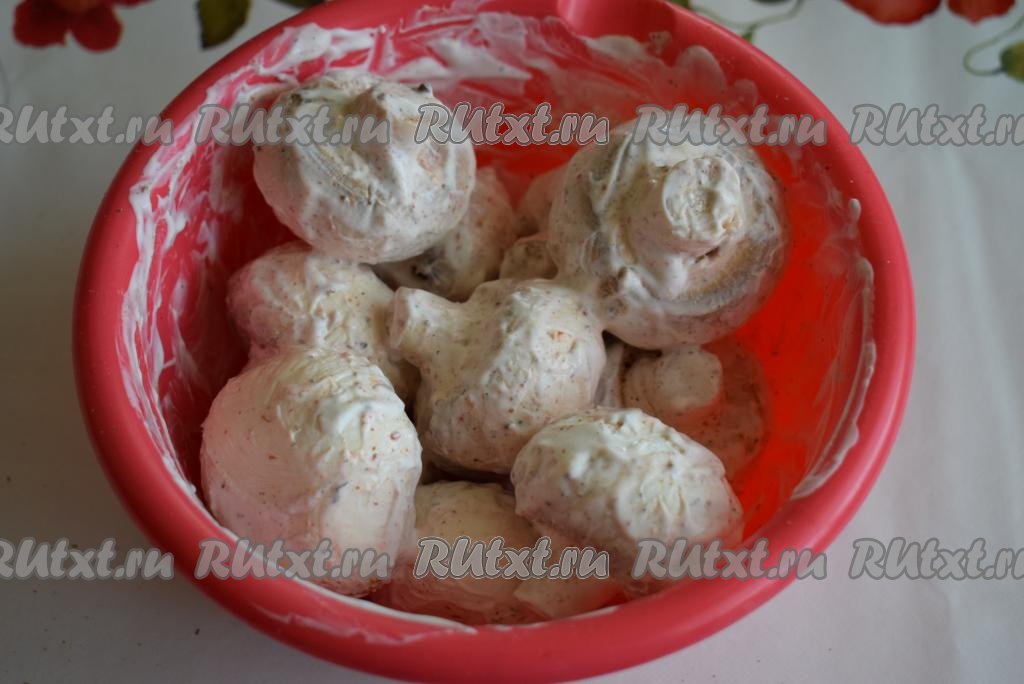 Перемешиваем шампиньоны руками, стараясь, чтобы сметана со специями и солью полностью покрывала каждый гриб.
