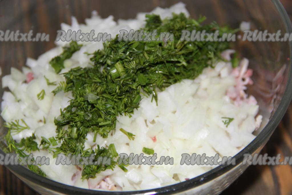 Свежую зелень вымыть, обсушить, мелко нарезать и добавить в начинку из колбасы и лука.