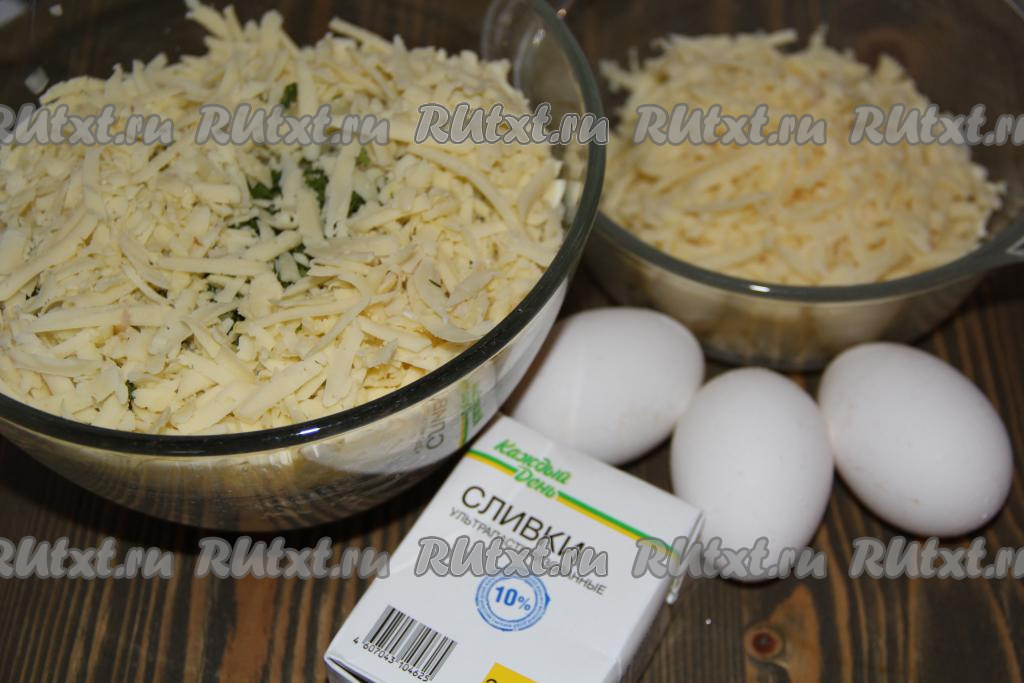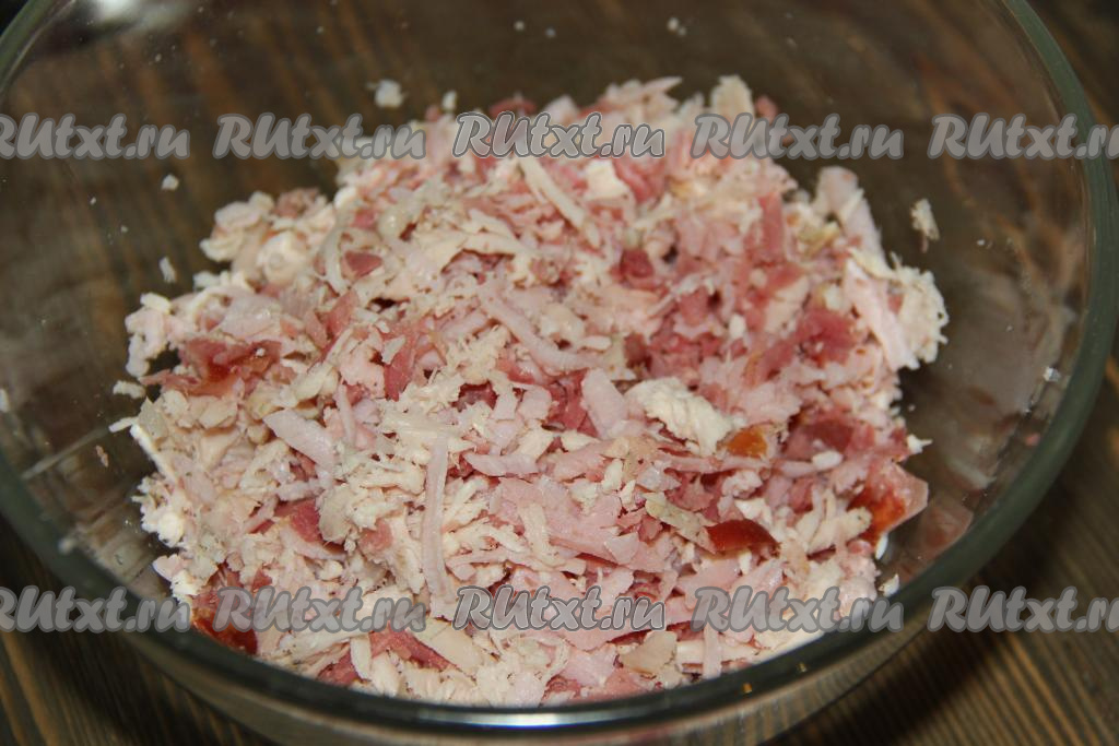 Твердый сыр натереть на крупной тёрке. Половину сыра добавить в начинку, вторую половину - отложить в глубокую миску.