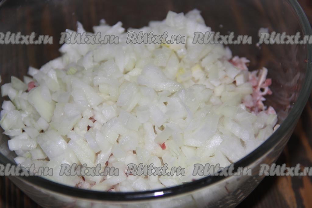 Очистить репчатый лук, мелко нарезать и добавить к колбасе.