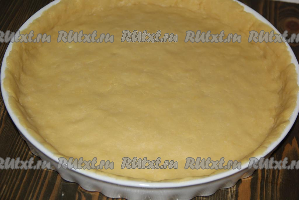 Тесто достать из холодильника и, слегка раскатав, выложить в форму (я использовала форму диаметром 28 см). Равномерно распределить тесто по всей форме, включая бортики (форму, по желанию, перед выкладыванием теста можно смазать маслом).