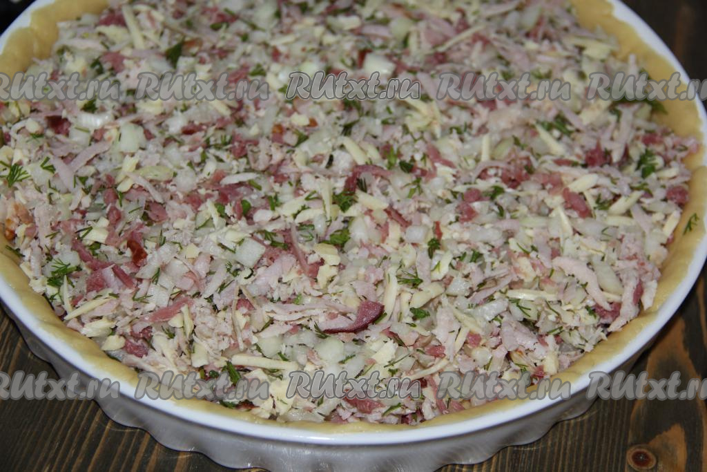 Выложить колбасно-сырную начинку на тесто и разровнять.