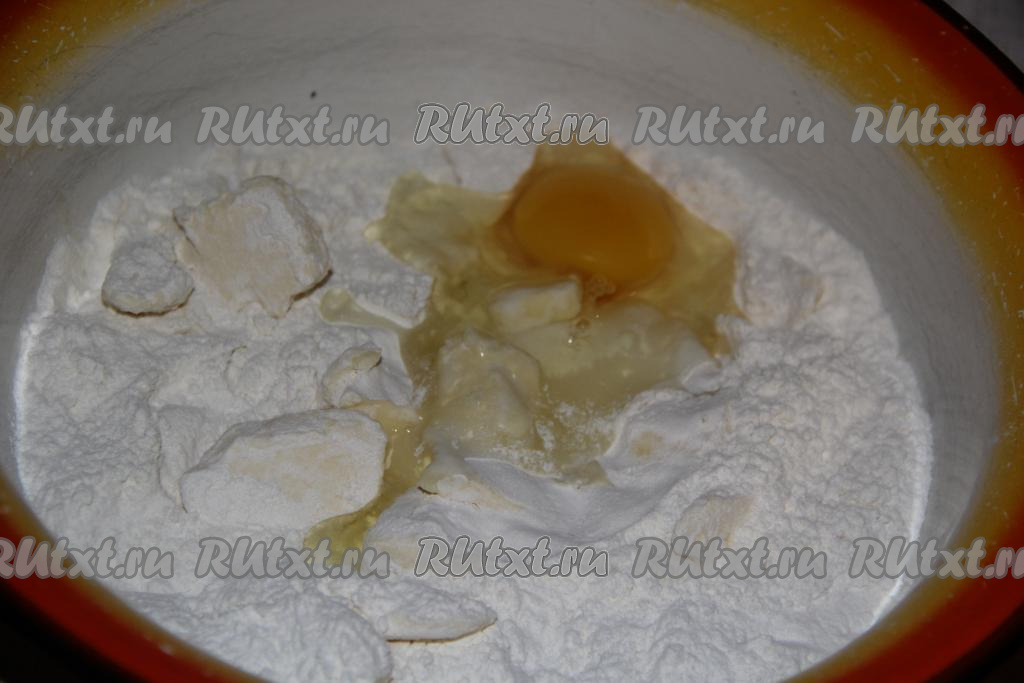 Затем добавить кусочки холодного сливочного масла и яйцо.