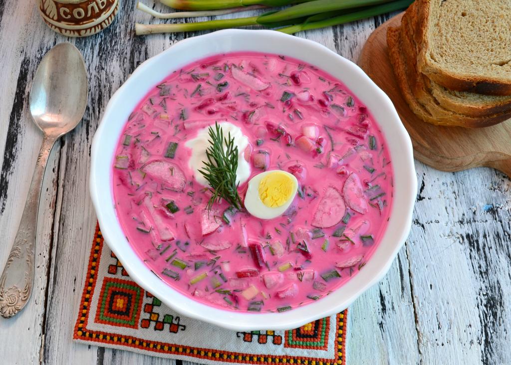 Поместить легкий и очень вкусный свекольник, приготовленный на кефире, в холодильник на 30 минут и можно разлить по тарелкам. Подать холодный свекольник со сметаной и половинкой отварного яйца.