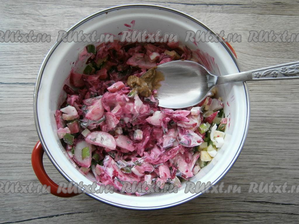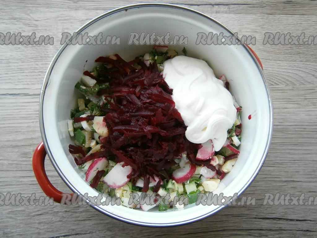 Свеклу очистить и натереть на крупной терке, добавить ее к остальным продуктам. Также добавить сметану.