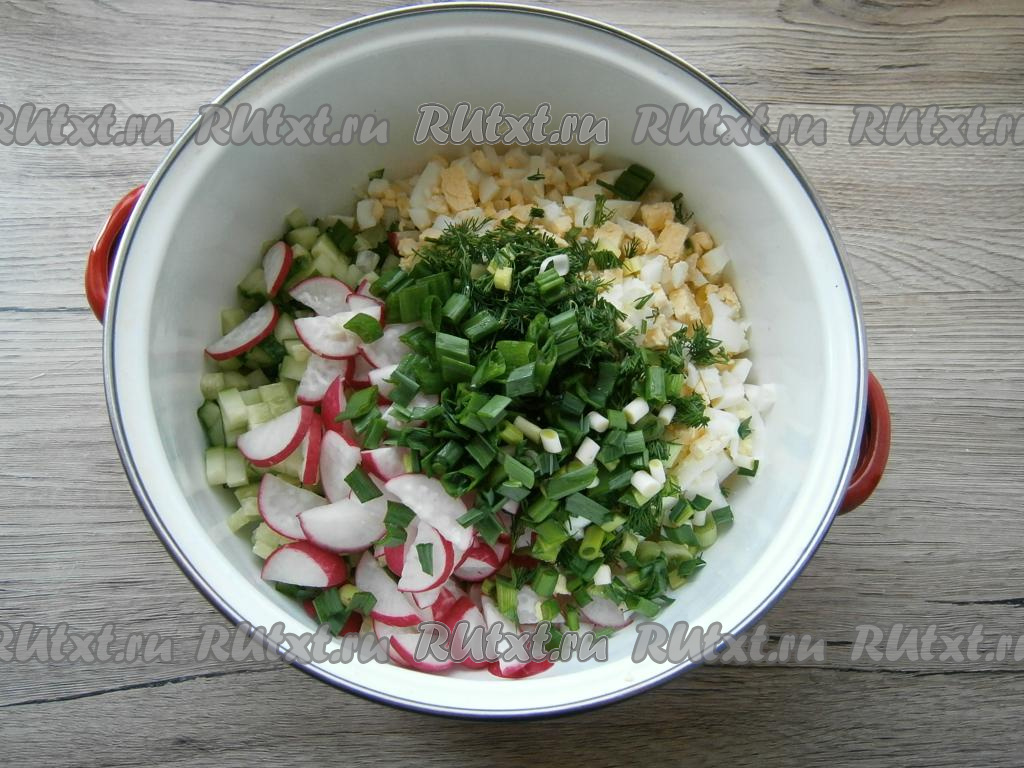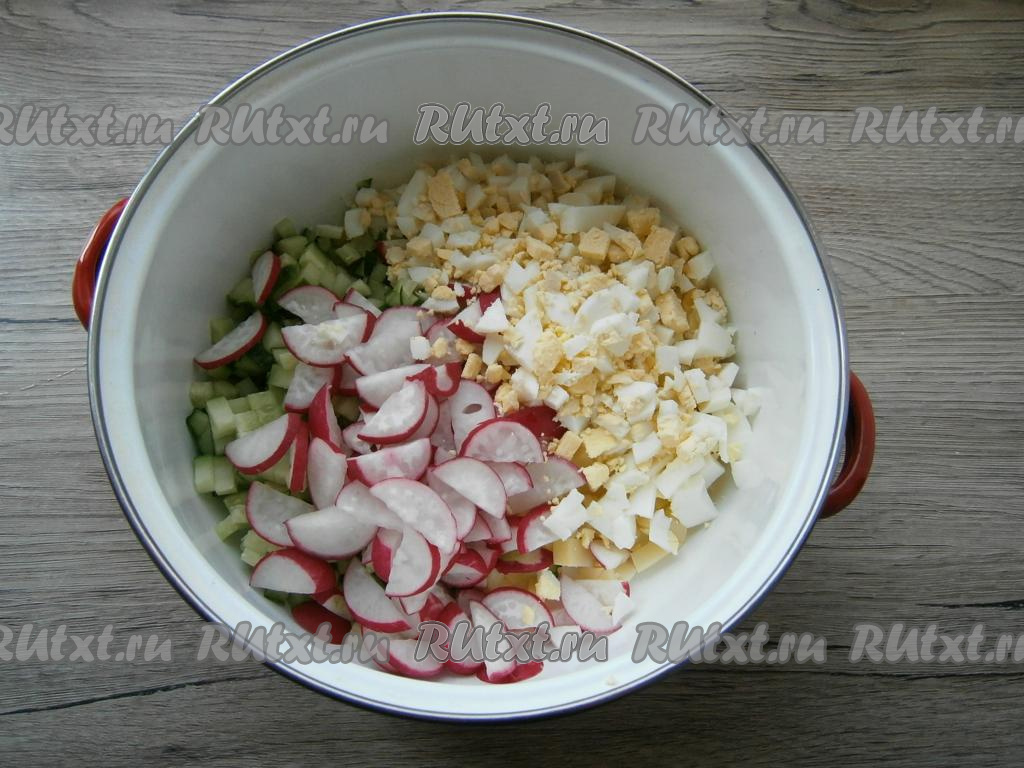Добавить нарезанный тонкими полукружочками редис и рубленные вареные яйца.