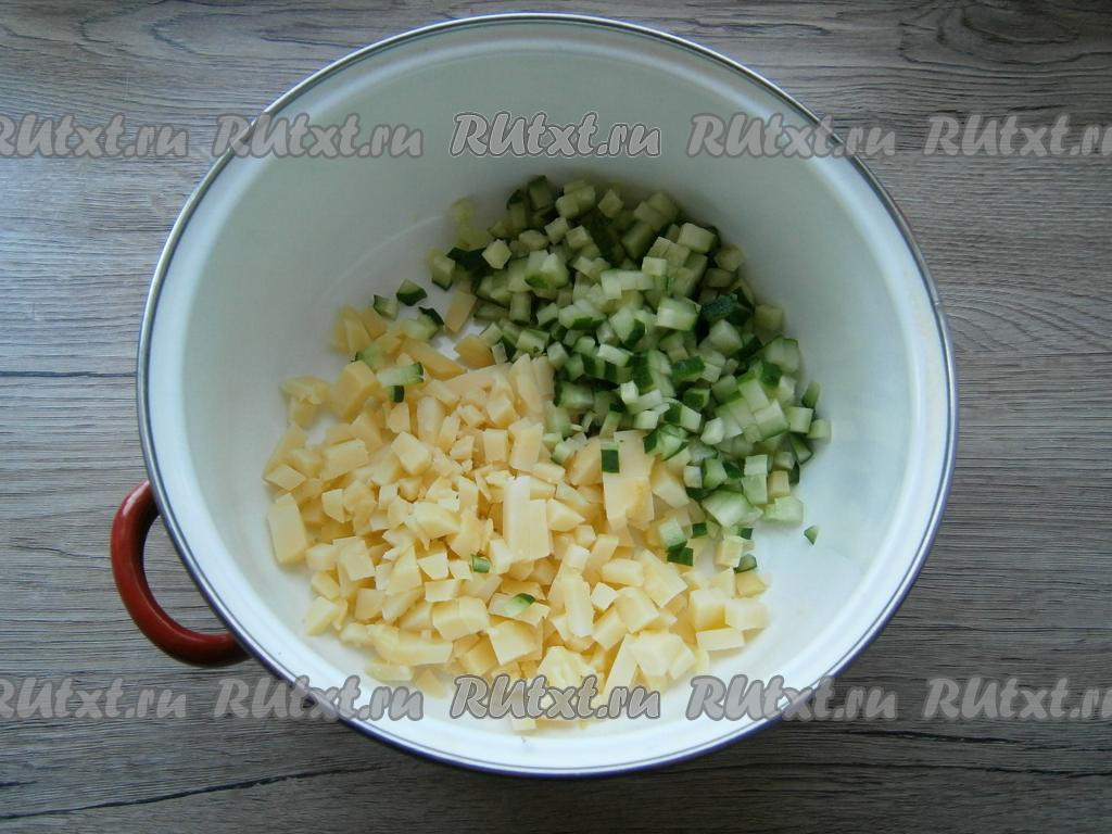 Вареный картофель очистить и нарезать небольшими кубиками, также нарезать свежий огурец.