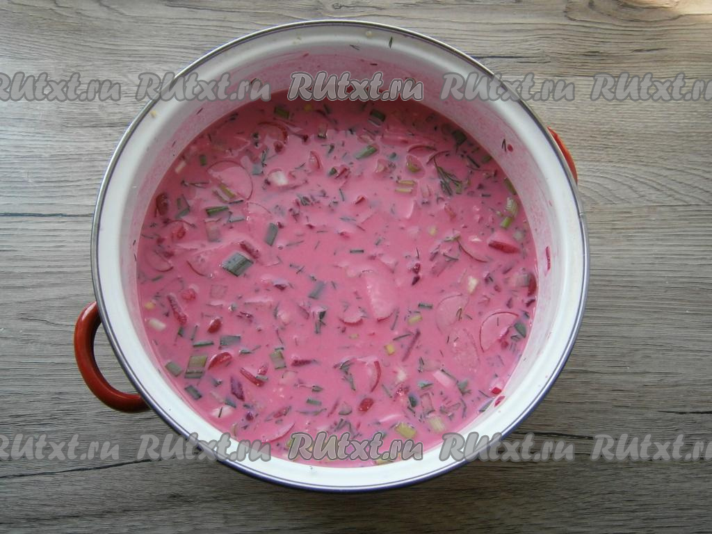 Влить в свекольник кефир (для этого блюда лучше брать нежирный кефир).