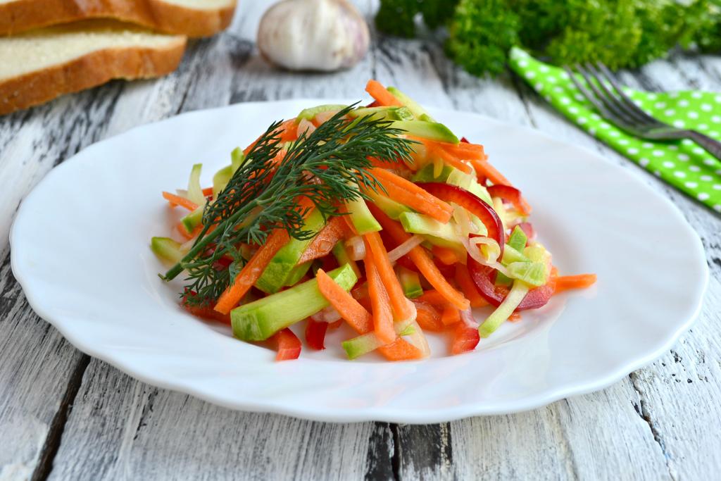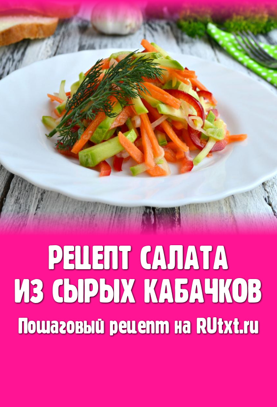 Салат из сырых кабачков, приготовленный по этому рецепту, получается вкусным, легким, ярким. Он отлично подойдет к мясу и рыбе, его можно употреблять и в самостоятельном виде. Салат выглядит очень красочно и возбуждает аппетит. Кабачки для этого блюда следует использовать молоденькие, с недозрелыми семенами и нежной кожицей. Обязательно попробуйте этот простой и вкусный салат!