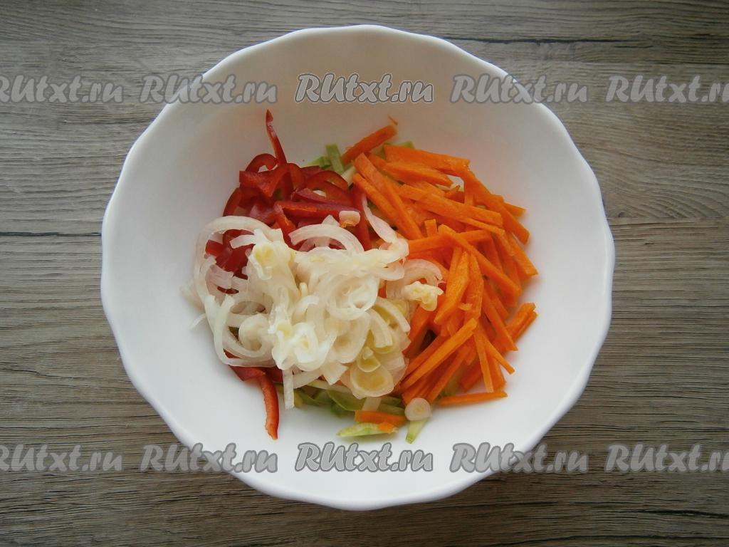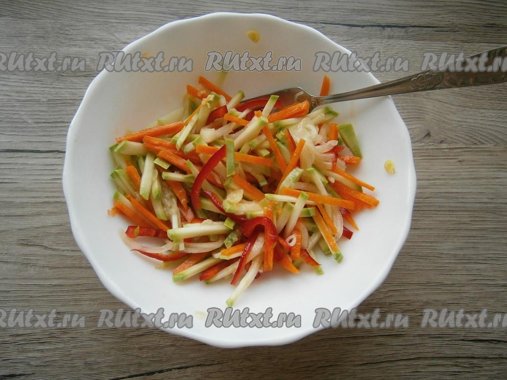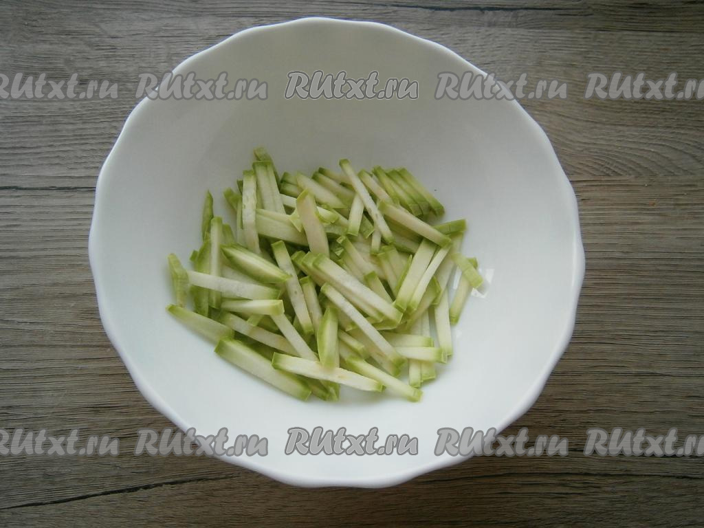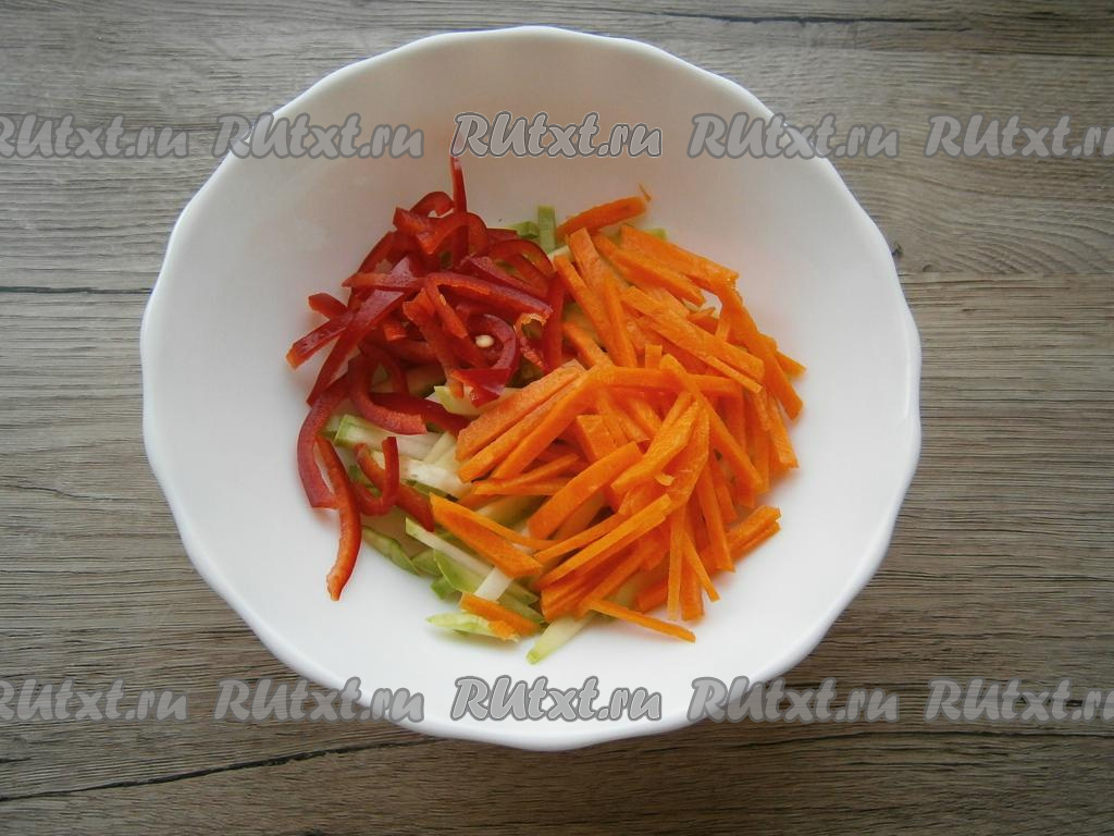 Морковь и сладкий болгарский перец тоже нарезать тонкой соломкой и выложить к кабачку.