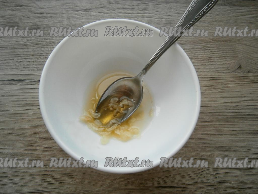 Приготовить заправку: к растительному маслу добавить мед, соль, уксус и измельченный чеснок, тщательно перемешать.