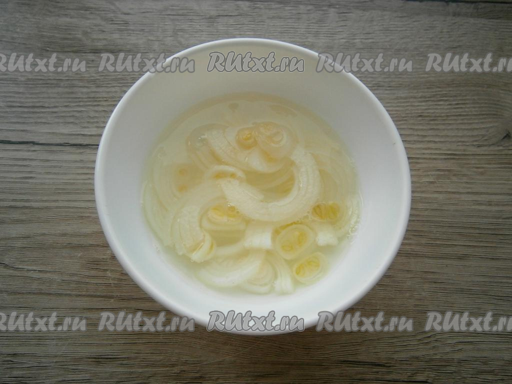 Репчатый лук нарезать тоненькими полукольцами, залить кипятком и оставить на 5 минут.