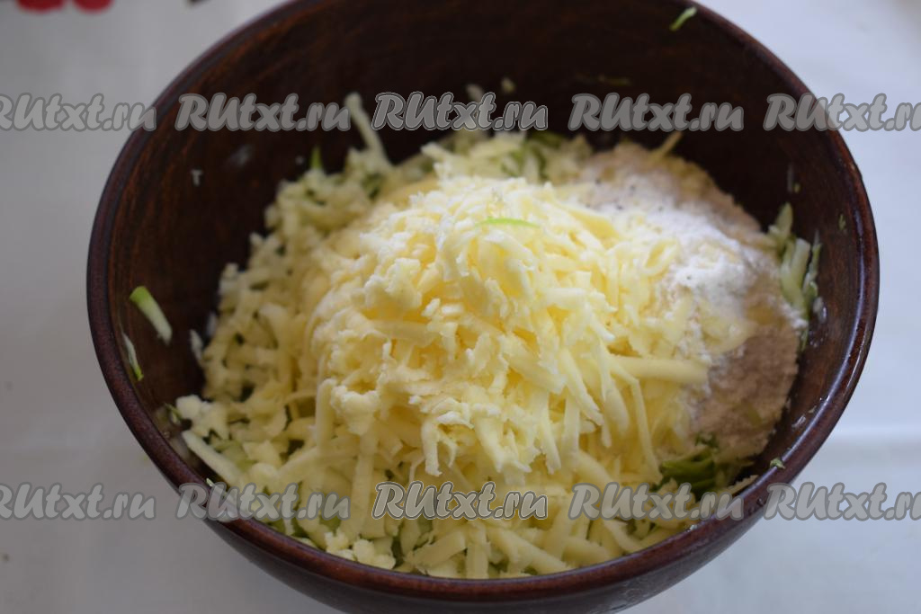 Натрем 60 грамм сыра на крупной терке и добавим к кабачковой массе.