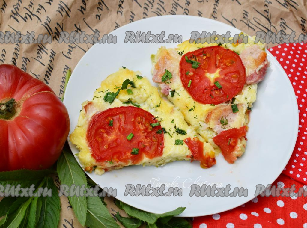 Присыпаем натертым сыром и выкладываем кружочки помидоров.