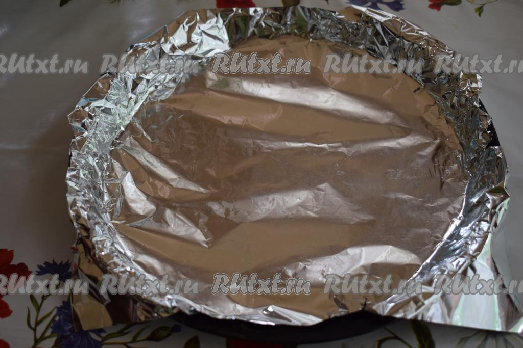 Берем форму для выпечки, в которой будем запекать нашу пиццу (у меня форма диаметром 22 см), застилаем её фольгой или пергаментом и присыпаем мукой.