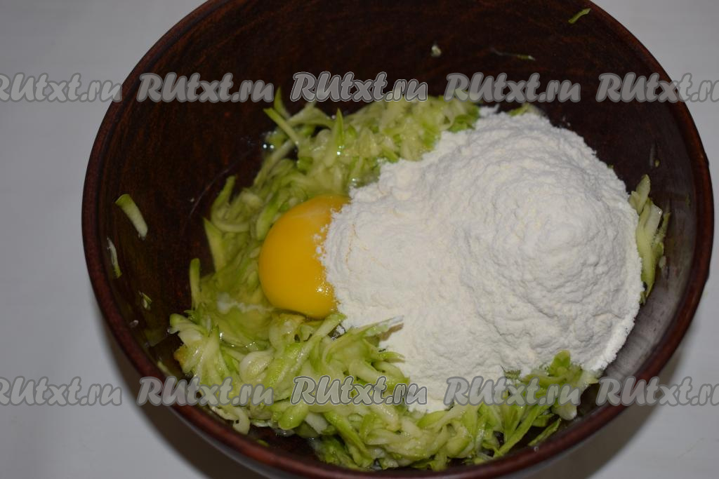 К отжатому кабачку добавим яйцо и муку.