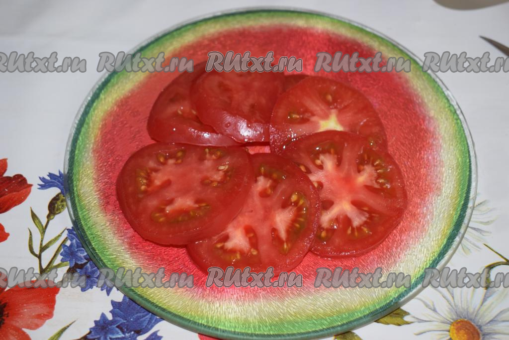 Подготовим ингредиенты для начинки кабачковой пиццы. Нарезаем помидор на кружочки.